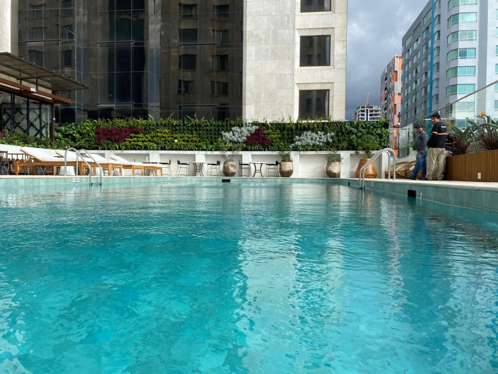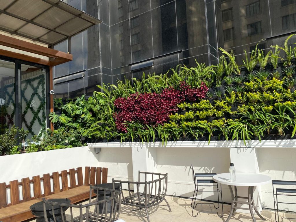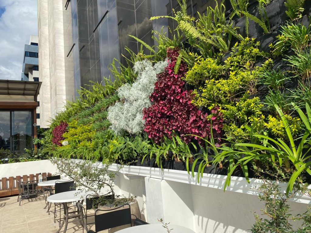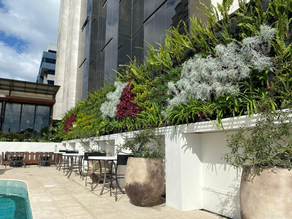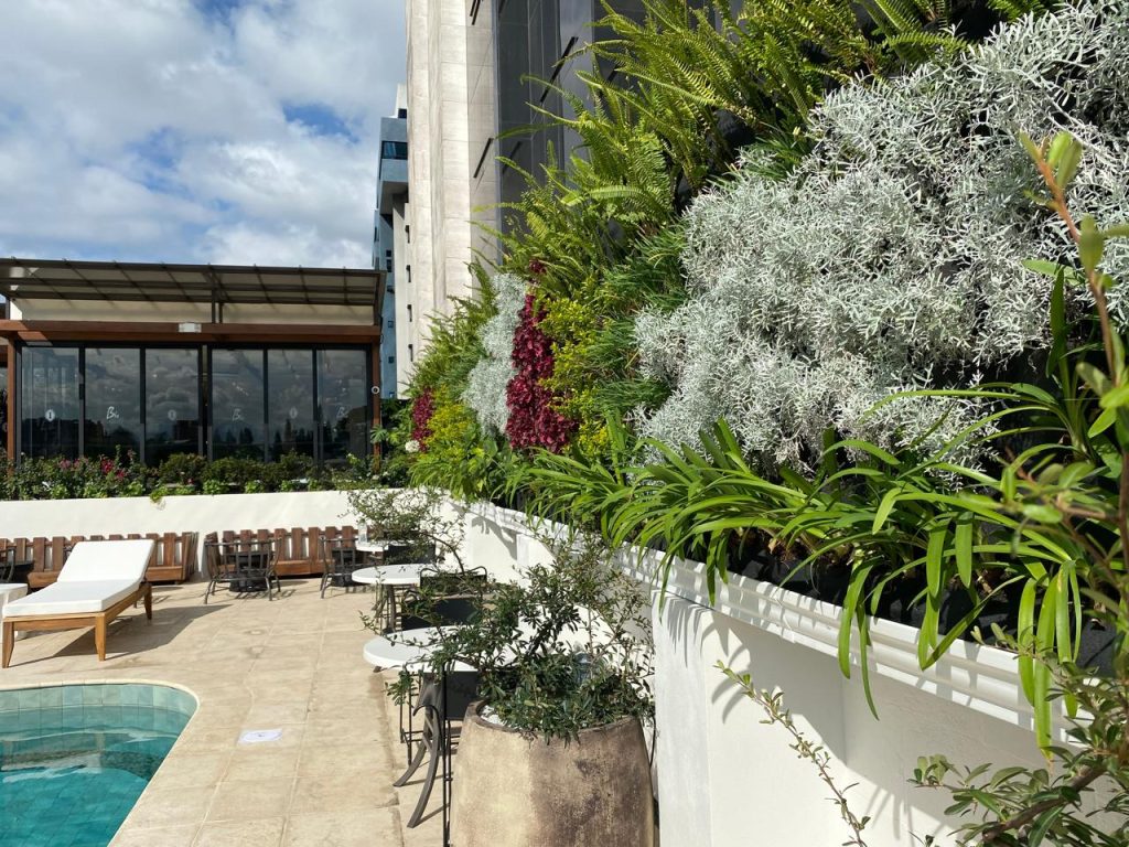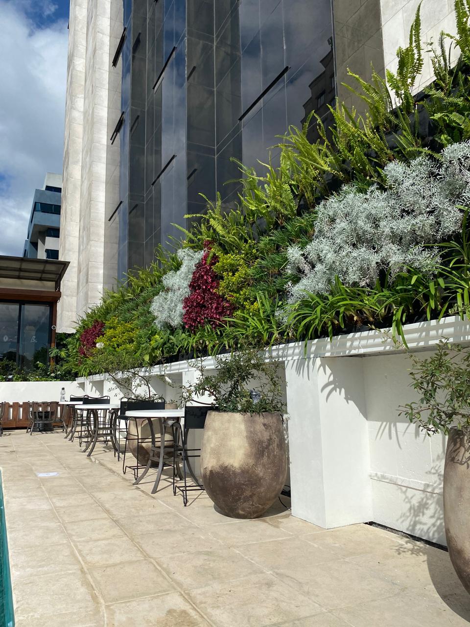 Se instalaron jardines verticales y jardineras perimetrales con plantas como follajes plateados, verdes intensos y toques de color vibrante que aportan frescura y dinamismo al espacio. Además, se aseguró la integración con la arquitectura moderna del hotel, logrando un equilibrio entre funcionalidad y estética.